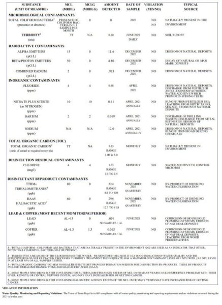Once again, the Town of Front Royal provides you with our annual water quality report. This edition covers all testing completed from January 1 through December 31, 2021. We are pleased to inform you that our compliance with all state and federal drinking water laws remains exemplary.