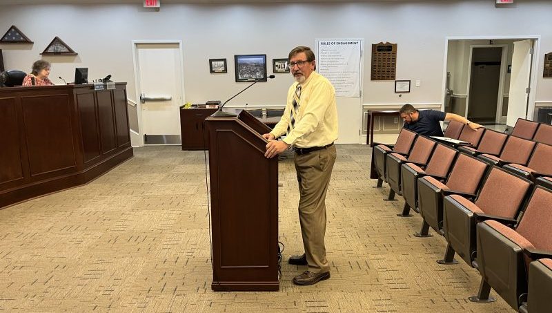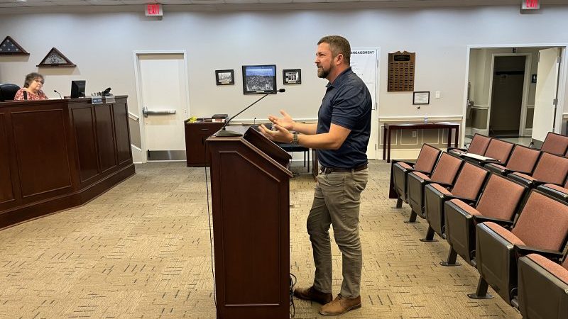 Seth Roderick of Monteverde Engineering and Design Studio addresses the commission on behalf of his clients in the application for approval of a preliminary plan for a major subdivision.