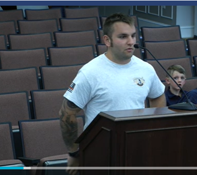 Permit Applicant William Kryssing addresses the Front Royal Planning Commission to urge them to recommend approval for his Mural proposal for his building at 1314 N. Royal Avenue, a 2-sided mural to commemorate emergency first responders. The Commission went on to approve the permit request for a total of 610 square feet of hand-painted murals. Royal Examiner Photos Stephen Sill