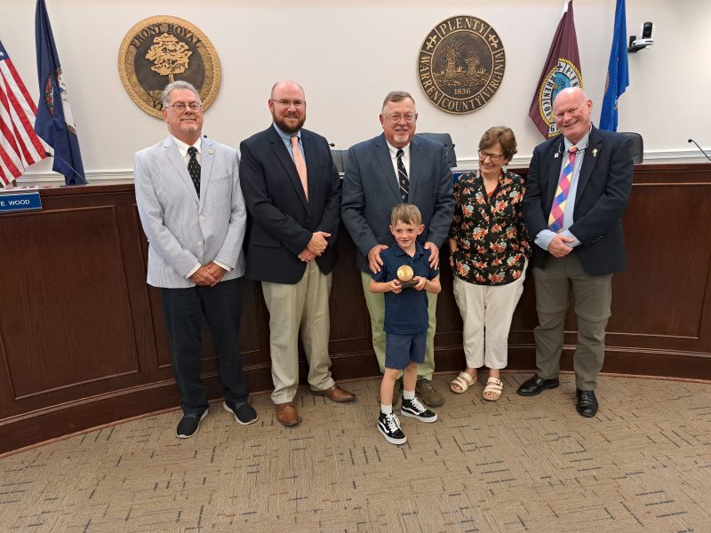 The Town Planning Commission gathers for a final picture with outgoing Chair Darryl Merchant, who appears to be craftily recruiting his replacement about 20 years early – His Grandson Christian! Left to Right: Commissioner Wood, Commissioner Wells, Chairman Merchant, Commissioner Marshner, and Commissioner Williams. Below, Making his mark! The Planning Department presented outgoing Chairman Merchant with an engraved US Geodetic Survey Marker Pin