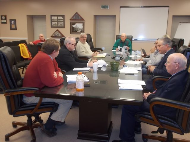 Getting down to business – As Mayor Tewalt chairs meeting at head of Town Hall Conference Room table, County Administrator Doug Stanley, center left, reviews paperwork on County projects of interest to Town officials.