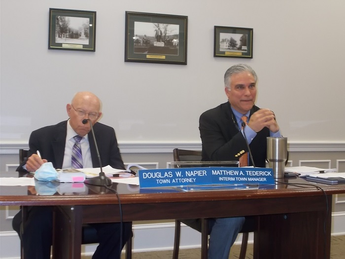 Properly social distanced, the interim town manager and town attorney during June 22 regular council meeting. Tederick was left laughing at the suggestion he was poised for a third council appointment, though without an ‘interim’ attached to it if council’s new EDA gets off the ground.