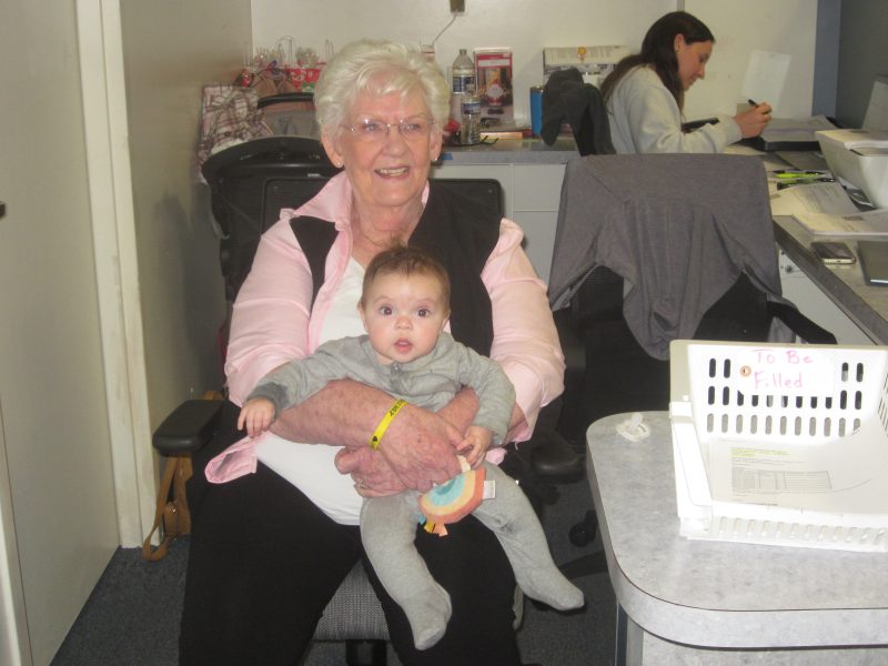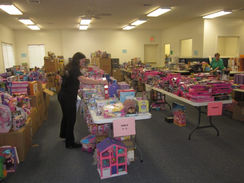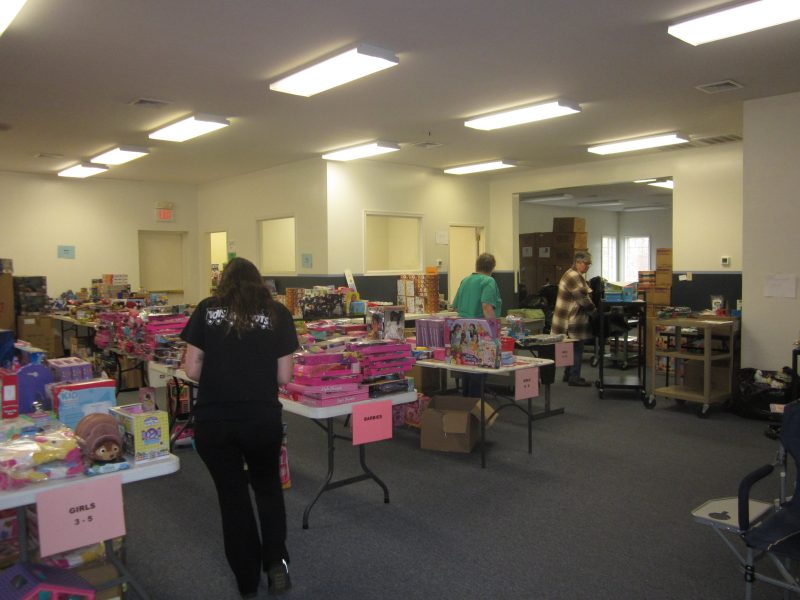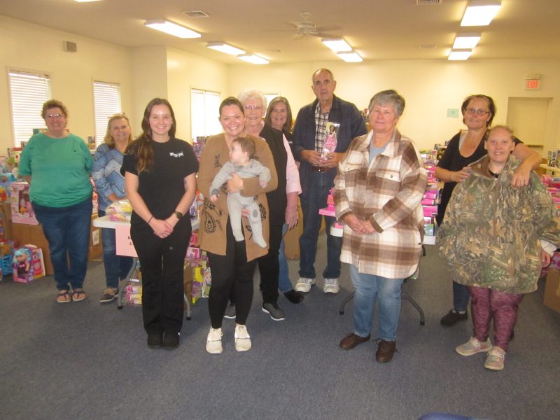 Bonnie Henry with great-granddaughter Gemma Blevins during the Nov. 20 gift collection and categorization. Below, Gemma after hearing about the Toys for Tots effort, volunteered to help, with mom Breauna Henry, left, and aunt Alyssa Henry’s assistance.