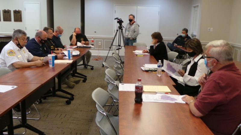 Above, County Board and Pandemic Emergency Management Chairman Walt Mabe on the job, masked as he urged constituents to be as part of a proactive effort to keep Coronavirus pandemic numbers down here. Below, an Oct. 6 county board work session were an Emergency Services personnel report included impacts on volunteer and part-time staff losses due to COVID-related variables.