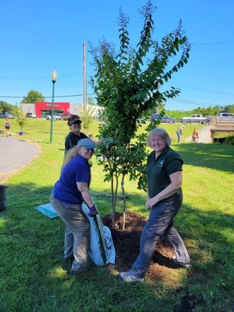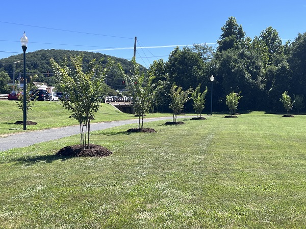 If you drove along South Street in Front Royal last Friday or Saturday, you may have noticed a lot of activity along the section of the Royal Shenandoah Greenway that crosses Royal Plaza. On Friday, the crew from the Department of Public Works was busy digging holes in preparation for a major tree planting. On Saturday, August 13th, members of the Environmental Sustainability Advisory Committee, the Front Royal Warren County Tree Stewards, the Front Royal Warren County Anti-Litter Council, and citizen volunteers came together to plant 18 Crepe Myrtles (Natchez variety) and 4 native SweetSpire shrubs along the greenway.
