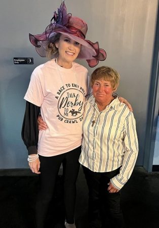 Wearing traditional ladies’ fancy Kentucky Derby headgear, Crystal Cline poses with retired jockey Diane Crump, the first woman horse race rider in the country and the first woman to compete in the Kentucky Derby. Photos by Blake Pierpoint.