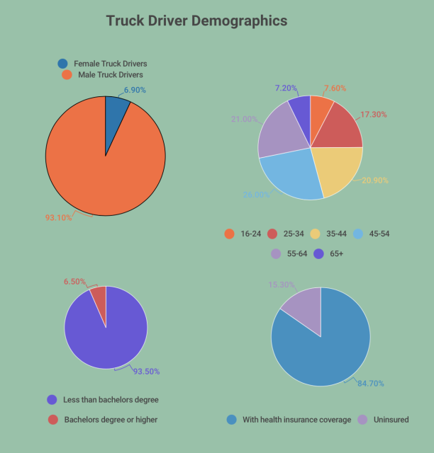 Age is not the only demographic where the trucking industry is an outlier. Women account for over 6% of truck drivers compared to over 47% of the general workforce, according to a 2017 survey conducted by the Census Bureau.
