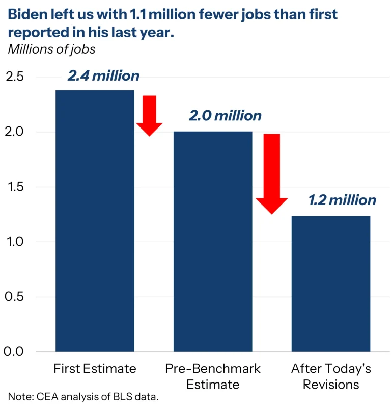The report also included revisions to past job data, revealing that job growth during the final two years of President Biden’s term was overstated by approximately 1.9 million jobs. The White House seized on that revision to contrast the current economic trajectory with what it called the “Biden disaster.”