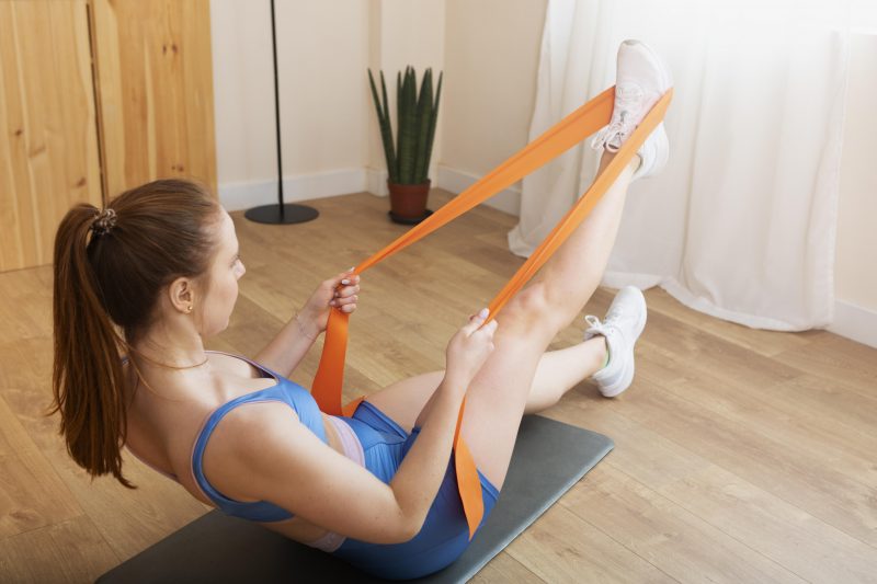 Sit on the floor with your legs straight in front of you, feet more than shoulder-width apart. Loop your resistance band (a band with handles is best for this exercise) and cross the handles in front of you to make an X shape. Pull the handles slowly and carefully into your ribs, making sure to sit up straight and let your back muscles do the work.