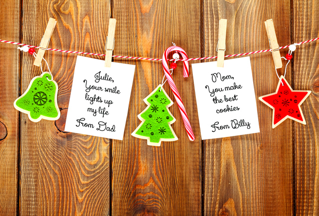 Here’s how to do it: write something you love about each family member on note cards. Attach them to a string of red and white bakers twine with clothespins, along with other seasonal decorations.