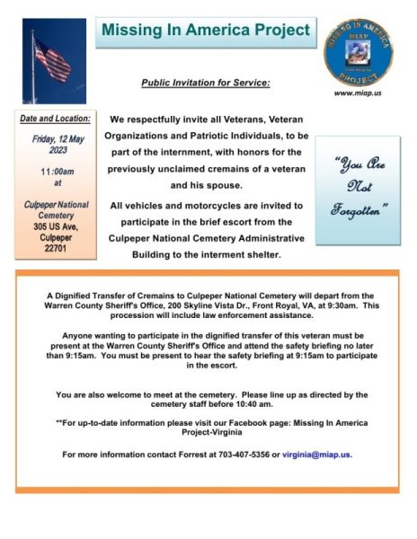 In Front Royal, Virginia, the Missing in America Project is set to hold a ceremony to honor the veteran and his spouse, whose cremains have been in the care of the Warren County Sheriff’s Office. The event will take place at 11:00 am on Friday, May 12, 2023, at the Culpeper National Cemetery in Culpeper, VA.