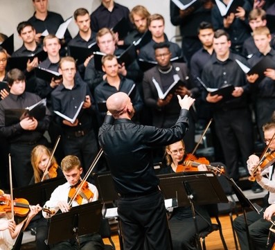 Dr. Ryan Keebaugh conducting EMU’s University Choir and Orchestra