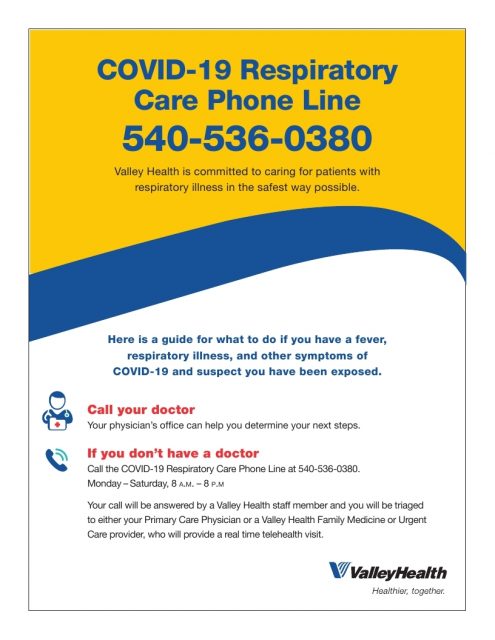 Valley Health has established a community call line for patients with respiratory symptoms and possible COVID-19 symptoms; anyone can call this line. However, the intended purpose is to provide our citizens who do not have a Primary Care Physician a non-emergency number to call for respiratory/COVID-19 related assistance. The number is (540) 536-0380; operational hours are 8:00 AM to 8:00 PM, Monday through Saturday.