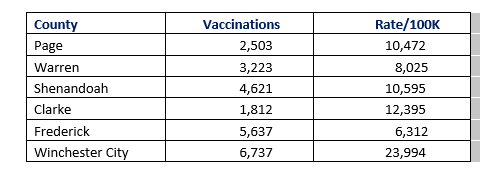 Virginia Department of Health data reported on January 26, 2021breaks down vaccination rates by jurisdiction: