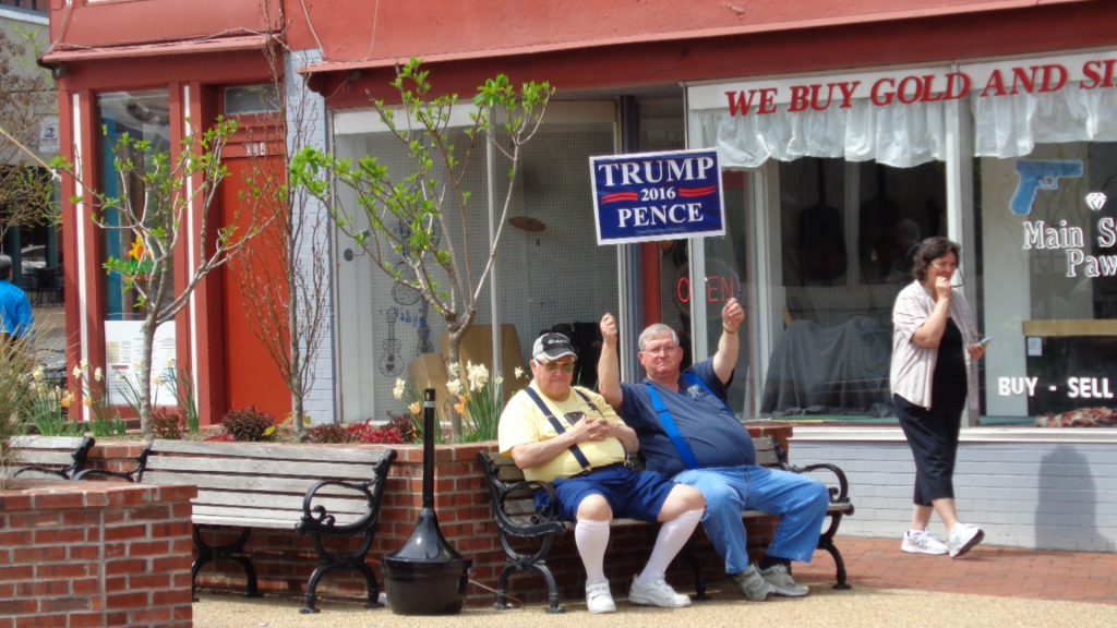 As we have pointed out elsewhere on our pages, to every action in the universe there is a reaction. And the majority Front Royal-Warren County conservative population that gave Trump a 66% to 29% margin over Hillary Clinton in November WAS represented across Chester Street on April 12. On a bench in front of their pawn shop, Ralph and Michael Waller proudly displayed the “loyal opposition” with a Trump-Pence poster. In fact, we followed Post reporter Portnoy into the pawn shop after the vigil broke up at 1 p.m. to make sure my old friends weren’t picking on the out-of-town “liberal media” too hard.