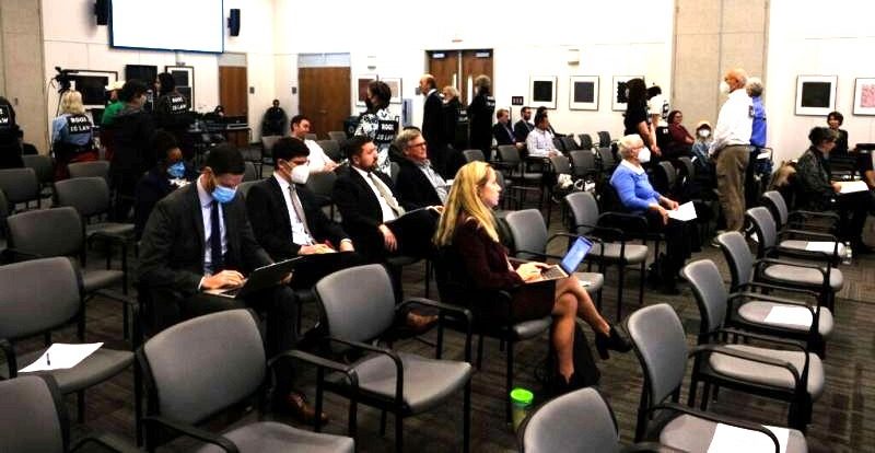 Audience members at the Air Pollution Control Board meeting show their backs with a sign taped to them that reads “RGGI IS LAW,” a phrase used by advocates of participation in the Regional Greenhouse Gas Initiative. (Charlie Paullin/Virginia Mercury)