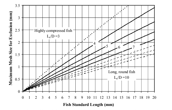 A graph depicts the maximum mesh, or screen opening, size that can be used to exclude fish of various lengths. (Photo courtesy of Gowan, Garman and Shuart)