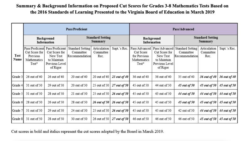 Gecker said in an email that the board saw the purpose of the cut scores on the SOLs as providing an assessment of whether a student has sufficient knowledge to advance to the next grade.