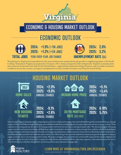 The Virginia REALTORS® association has released its highly anticipated 2025 Economic & Housing Market Forecast, predicting a positive outlook for the state’s housing market. The forecast suggests a rise in home sales, stabilizing mortgage rates, and modest growth in home prices—all driven by a combination of pent-up demand, an increase in active listings, and improving economic conditions.