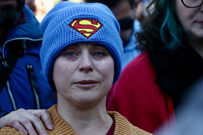Richmond resident Emily Turner, a friend of the late Adam Turck, who died from gun violence, sheds a tear while participating in a litany outside of Virginia’s state Capitol on Jan. 19, 2026. (Photo by Charlotte Rene Woods/Virginia Mercury)