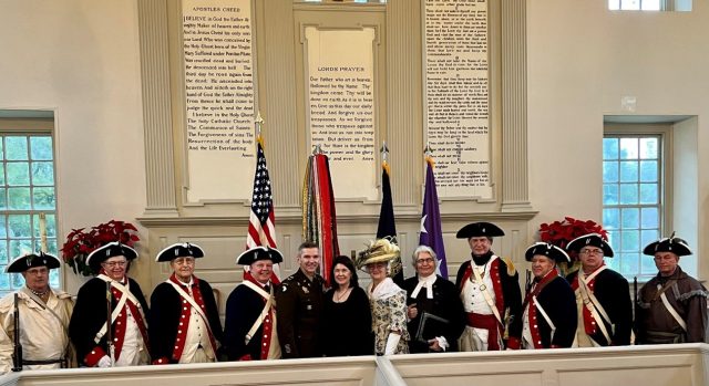 On February 4, 2022, members of the Virginia Society, Sons of the American Revolution (SAR) had the honor of participating in the promotion ceremony for Chaplain (Lt. Col.) J. Mark Morgan to the rank of colonel. The Colonel William Grayson Chapter co-sponsored the ceremony. The ceremony was held at the historic Pohick Church in Lorton, Virginia. Pohick was the first permanent church in the colony to be established north of the Occoquan River, sometime prior to 1724 and is where George Washington frequently attended services. The presiding officer over the ceremony was Chaplain (Maj. Gen.) Thomas L. Solhjem, 25th Chief of Chaplains, United States Army.