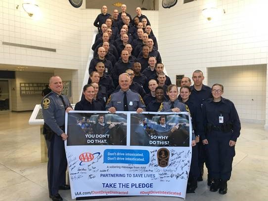 With the onset of the 2019 winter holiday season, state police is proud to support the Virginia Department of Motor Vehicles (DMV) Highway Safety Office and AAA Mid-Atlantic with its new traffic safety campaign aimed at heightening awareness of the deadly dangers of distracted driving. Earlier this month, Virginia State Police Superintendent, Col. Gary T. Settle, and Trooper-Trainees of the 131st Basic Academy Session signed a banner to pledge their support to the “Don’t Drive Intoxicated. Don’t Drive Intexticated” campaign and its life-saving messaging.