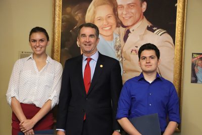 2019 Marocchi Memorial Scholarship recipients meet with Virginia Governor Ralph Northam at the Virginia War Memorial. (L-R) Katie Lloyd, Caroline High School, Governor Northam, Alan Clark, Lake Braddock Secondary School