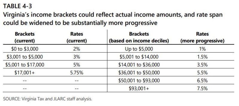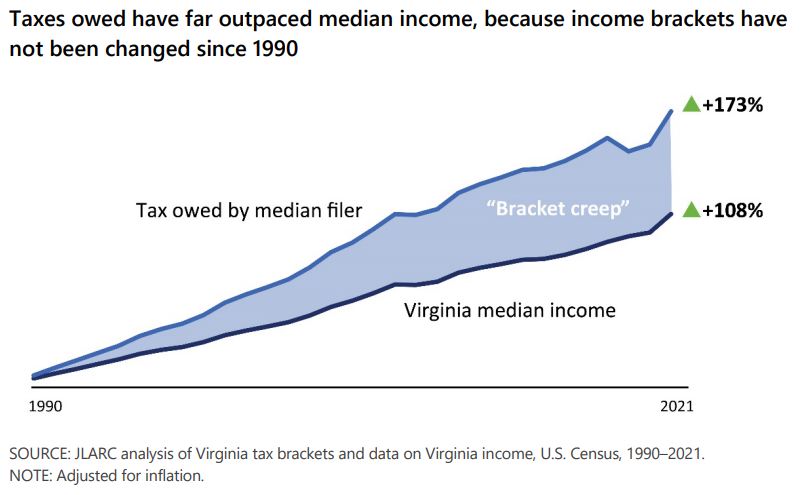 “Tax experts refer to this dynamic as ‘bracket creep,’” the state’s Joint Legislative Audit and Review Commission wrote in the report on how Virginia could make its tax system fairer. “Incomes rise over time, but income tax brackets do not.”