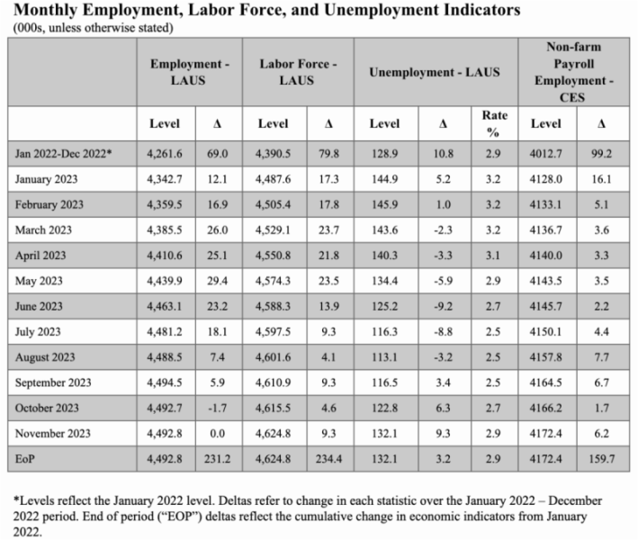 November’s data showed a slight increase in the seasonally adjusted unemployment rate to 2.9 percent, still below last year’s rate. The overall labor force saw an addition of 9,331 people, totaling 4,624,846, with the number of employed individuals rising to 4,492,761.