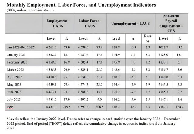 Amidst this labor growth, the state’s unemployment rate also took a positive turn. July’s unemployment dropped by 0.2 percentage points to 2.5%, which stands notably below the national average of 3.5%. This rate reflects a promising trend toward pre-pandemic stability.