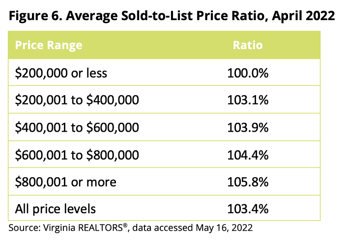 In Virginia, the steady upward trajectory of home prices has not been hindered by the slowdown in sales activity or the recent spike in mortgage rates. In April, homes sold for 3.4% higher than list price, on average. In all price segments, the average sold-to-list price ratio was at least 100%.