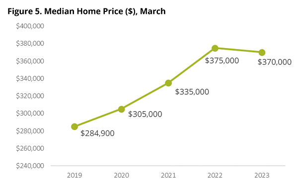 According to the March 2023 Virginia Home Sales Report released by Virginia REALTORS®, the median sales price in Virginia in March was $370,000, inching down 1.3% from last March, a $5,000 decrease. This is the first time in seven years that a year-over-year decline in the median sales price has occurred in Virginia.