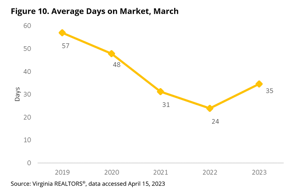 On average, homes are staying on the market longer in Virginia. The statewide average days on market in March was 35 days, 11 days longer than a year ago. As the market has cooled, it’s been taking longer to sell homes, on average, for the last eight months.