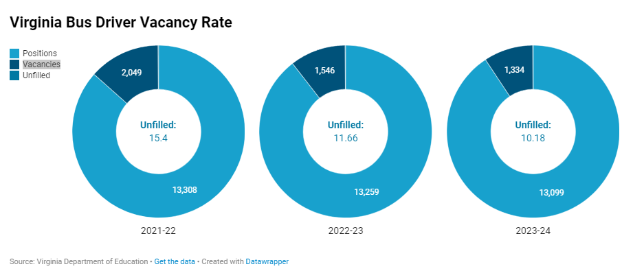 During the 2021-22 school year, Virginia recorded a vacancy rate of full- and part-time drivers at 16% in 2021-22. The rate decreased to 11% in 2022-23 and last year to 10%. Data on the upcoming school year ‘s driver vacancy rates will not be available until the fall.