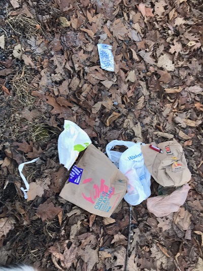 Roadside trash includes fast food containers, plastic bags, lighters, butts, bottles, cans, and Styrofoam.