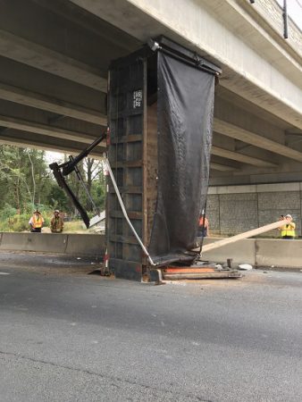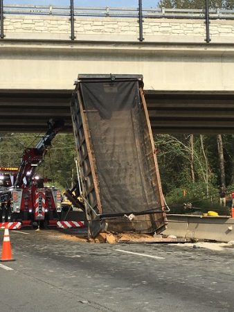 A 1998 Kenworth dump truck was traveling north on I-95 when the driver accidentally engaged the dump bed, which raised it and caused it to collide with the bridge overpass. The collision caused the dump bed to become wedged between the roadway and bridge.
