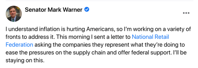 While he trusts economic forecasts that suggest the effects will likely be temporary, Sen. Warner is still trying to do everything he can to get more solutions now. This week, he wrote a letter to National Retail Federation (the world’s largest retail trade association, representing companies like Target and Wal-Mart) inquiring about efforts to ease the supply chain and offering federal assistance to help these initiatives. He said: