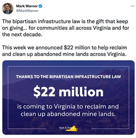 First, he announced $22 million dollars to reclaim abandoned mine lands – which will go directly towards creating local jobs to clean up defunct mine sites. More specifically, workers will seal dangerous mine shafts, reclaim unstable slopes, and improve local water quality by preventing acid runoff. It’s a move that will curb pollution, support the climate, stop harmful methane emissions AND provide a positive economic boon to Virginia as the restored lands can be used for key energy and economic development projects. Sen. Warner said,