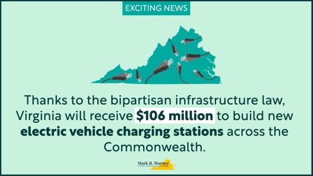 But the funding didn’t stop there. Sen. Warner also announced a $106 million investment in electric vehicle charging stations for Virginia as part of the BIL. This money – dispersed over 5 years, with an initial investment of $17 million – will go towards expanding the number of EV charging stations across the Commonwealth so they’re more accessible than ever. Sen. Warner said,