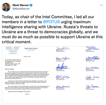 “Vladimir Putin is threatening the freedom and security of the Ukrainian people, and they have shown their eagerness to take action to defend their sovereignty, freedom, and democratically elected government. To this end, we request that the United States share intelligence with Ukraine to the fullest extent possible. Russia is the aggressor, and we need to arm Ukraine with critical information needed to defend their country.”