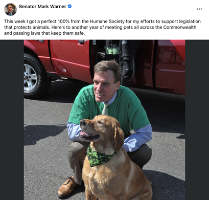 Sen. Warner has always tried to be an advocate for EVERY Virginian – and that includes four-legged friends in every corner of the Commonwealth! Following his consistently high ratings from the Humane Society, he launched two efforts to support animals this week.