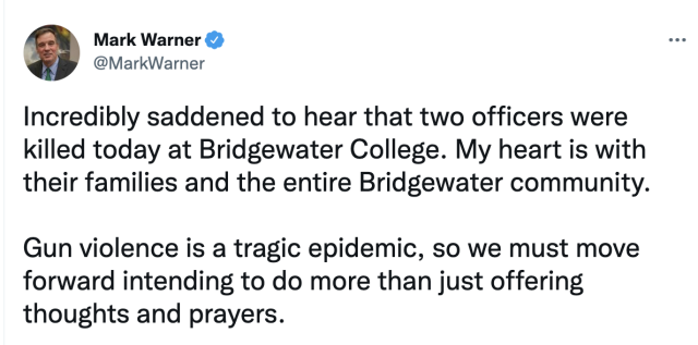 In addition to his work in the global intelligence community, Sen. Warner also remains laser-focused on monitoring threats domestically. This week he was briefed on two developing situations: first, the tragic murder of Officers Painter and Jefferson on the Bridgewater College campus. He offered condolences to the community and honored the lives of the men.