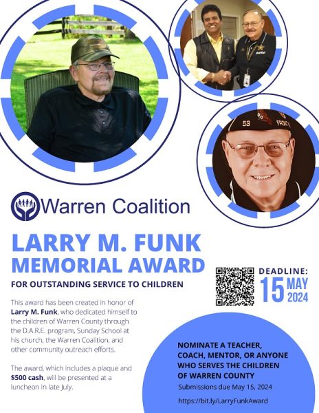 Nominations are now open for the 2024 Larry M. Funk Memorial Award for Outstanding Service to Children. This award was established by the Warren Coalition in 2022 to recognize an individual whose dedication and service to the children of Warren County have made a positive impact on them. The recipient, in 2022, was Roger Smelzer. Last year’s recipient was Laura Nelson Haas.