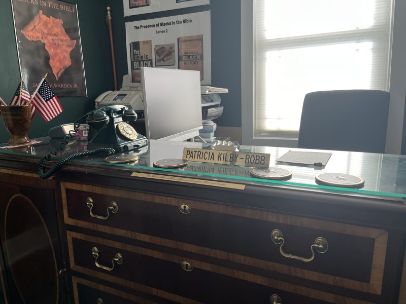 Above: Patricia Kilby-Robb, daughter of James Wilson Kilby and Catherine Elizabeth Ausberry Kilby, stands before a gathering in which many of her extended relatives are represented, for the opening of a museum dedicated to memorializing her father’s fight for civil rights in Warren County. Below: This desk space testifies that the Kilby Museum is not only a place for remembering but also a place to work and imagine the future.