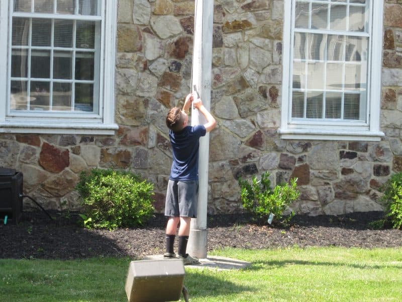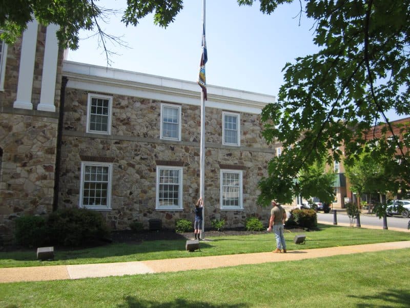 Reign Wahl lowers the Courthouse grounds State and County flags to half-staff, where they will remain between June 12 and June 17, the dates of Dr. Joseph Warren’s birth and death.