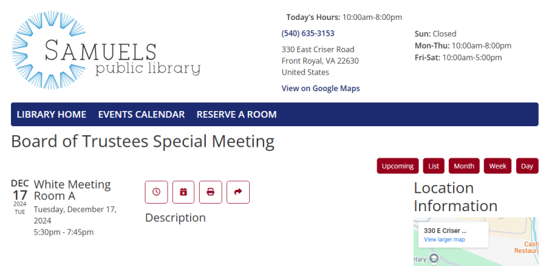 The Royal Examiner reached out to Samuels Public Library for comment: The Samuels Public Library website includes information about the December 17th meeting. As an organization receiving government funds, Samuels Library Inc. is classified as a public body under its funding agreement with Warren County and is therefore required to conduct its meetings in accordance with Virginia’s Freedom of Information Act (FOIA) guidelines, including proper public notice. Records show that the meeting was announced on December 13, satisfying the legal requirement for prior notice. Also to be noted, funds received from Warren County do not purchase assets for Samuels Library.