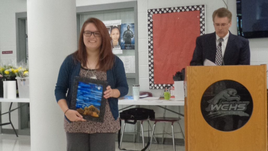 Caitie Himmelright, the teacher coming the farthest to join the school system, displays her reward, a work of art.