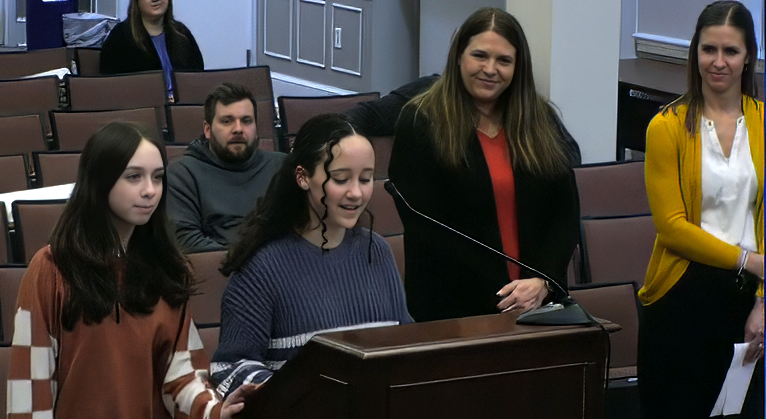 Club president Haley Proseus (L) and recording secretary Avery Hill, share their club’s mission and accomplishments with the Warren County School Board.