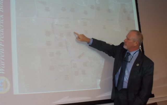 Warren County Administrator Doug Stanley points to a map indicating what was, and will now be following joint county approval of a boundary adjustment agreement between the North River and Opequon Districts of Warren and Frederick Counties. Royal Examiner Photo/Roger Bianchini . Video by Mark Williams.