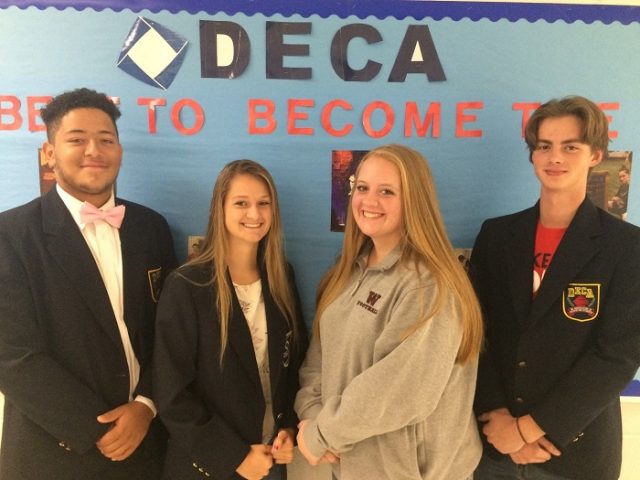2019-20 WCHS DECA Chapter Officers (L –R): Karenzo Hogue, Vice-President of Membership; Kylie Burnworth, President; Emily Johnson, SBE Manager; and Ethan Baldwin, Vice-President of Finance. (Not pictured: Patrick Coffron, Vice-President of Social Activity and Halea Hose, Reporter/Historian)